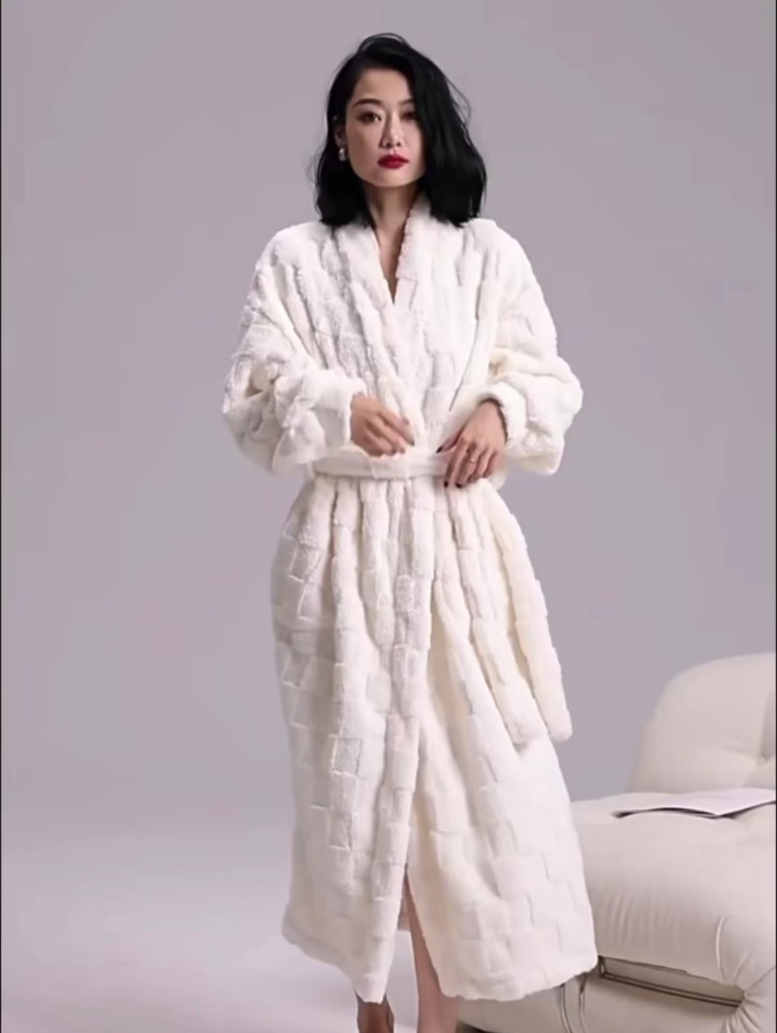 Luxurious Long Plush Textured Bathrobe with Belt – Soft Winter Loungewear for Women