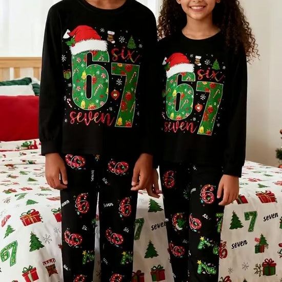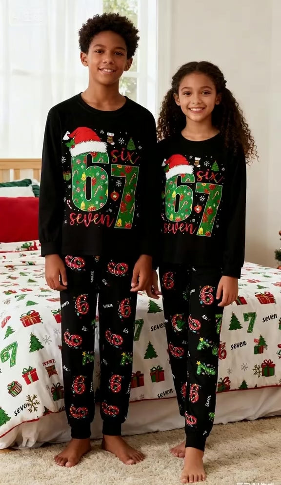 Make the holidays extra cozy and festive with our Kids Christmas Matching Pajama Set! This adorable set features a long-sleeve black top decorated with a bold “67” design in cheerful Christmas patterns, complete with Santa hats, ornaments, and playful holiday graphics. The matching pajama pants tie the look together with coordinating prints for a fun and festive outfit your little ones will love.